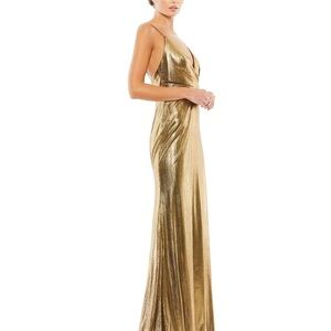 Elegant gold gown from Mac Duggal with a deep V-neckline and spaghetti straps. Fitted silhouette with a floor-length mermaid tail for a glamorous and dramatic look. Could also work for a size 10. Worn once.