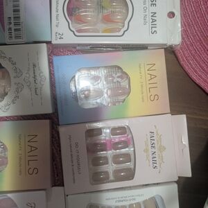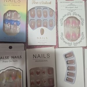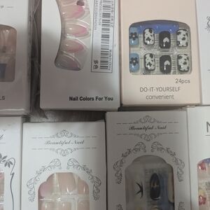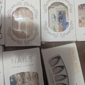 Collection of colorful press-on nail sets. Includes various designs and styles.set of 28 from short to medium length