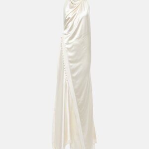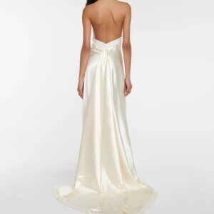 Silk crepe back satin handkerchief gown. Grosgrain edging and covered button detailing along side hip. Optional bustle loop on handkerchief corner hem. Slip on styling with button close at neck.