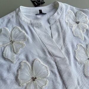 Ava & Grace Petite white short sleeve blouse showcases intricate floral appliques on the chest, detailed with delicate beadwork and shimmering sequins. Crafted from a textured, lightweight fabric, this top features a split neckline with a mandarin collar and cuffed dolman-style sleeves for a relaxed yet polished silhouette. The curved hemline and center back seam add subtle structural interest to this elegant piece. Please note: there are two very small, faint spots near the neckline as shown in the photos.