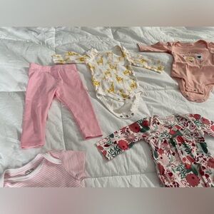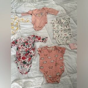 BUNDLE of 18 onesie bodysuits + 1 hat + 1 pair of pants. Assorted baby girl onesie undershirt 0-3m/3-6m. All have snap closure. 13 short sleeve onesies, 5 long sleeve onesie, 1 hat and 1 pair of pants. 20pcs total. They outgrow them so fast 🥲