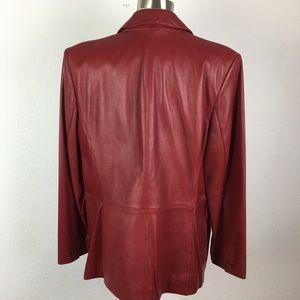 Classic red leather blazer. Single-button closure. Sharp lapel design.