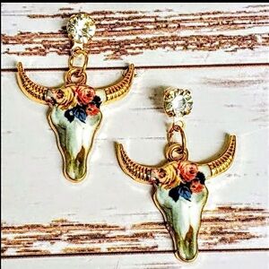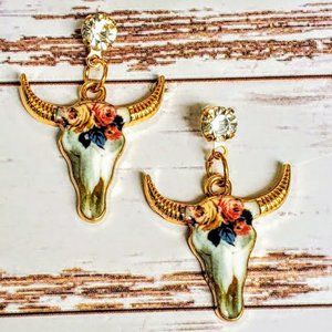 NWT Pretty Rose of Texas Southwest style earrings in gold tone over alloy metal. Acrylic covered floral steer head with crystal accents. Post style with gold tone back.
