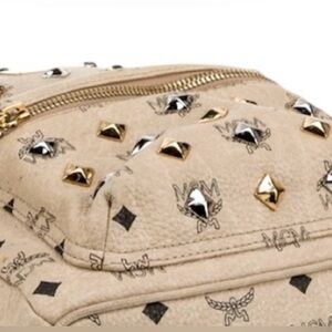 Stylish MCM Stark backpack in Beige. Features metallic studs and iconic logo design. Perfect for everyday use.