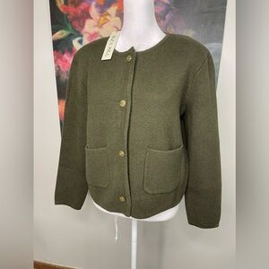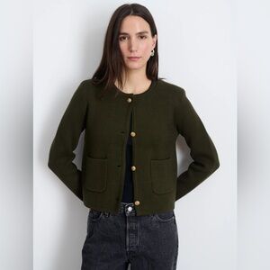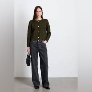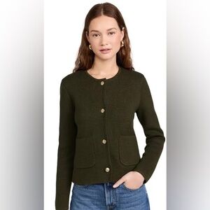 Chic olive green cardigan by Alex Mill. Features front pockets and button closure. Perfect for layering. Excellent used condition, no pilling or visible flaws.