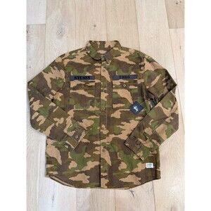 The product is a rare Stussy thick camo "International Worldwide Tribe" button up shirt in men's XL size. This vintage shirt features a unique camo design that represents a global community with a sense of unity and diversity. The Stussy brand is known for its streetwear and surfwear aesthetic, making this shirt a special addition to any casual wardrobe. The thick fabric adds durability and a quality feel to the overall look, making it a standout piece for those interested in vintage fashion.