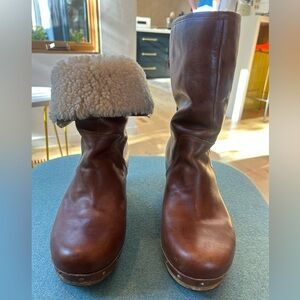 Good used condition, minimal wear, rich leather upper with plush shearling lined wooden platforms with rubber outsoles for traction and durability. Optional Fold over boot design. Shaft height 8 inches, 5 inches cuffed, 2 1/2 inch heel. Imported.