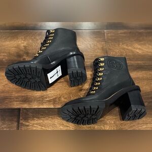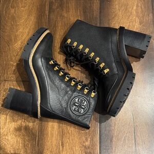 TORY BURCH Women's Miller Mixed-Materials Lug Sole Boot store displays boots whitout tag /durst bag or box only Nordstrom paper tag on the soles!! size 6,5 true to size From our iconic collection: the Miller Lug Sole Boot is utilitarian, chic and versatile. It features a mix of leather and suede, with brass eyelets and a high block heel — great with midi skirts and dresses.