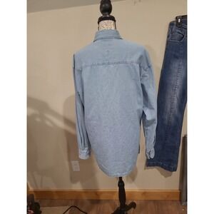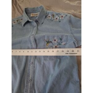 Vtg. Christine Alexander Lady SZ L denim button up shirt 100% cotton, hummingbird and flower embellished pocket, shoulders, and sleeve cuffs. Longer length with side vent. Coastal, Country, casual, garden and nature lover. Super cute and in great condition. Please see photos for condition, description, and measurements. Always happy to bundle and take offers. Thanks for looking.