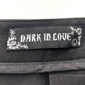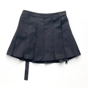 The Antagonist short skirt from Dark in Love: woven black fabric with an A-line cut, wide pleats and a detachable bag/pocket with chain embellishment. Side release buckle around waist and a chunky zipper off-center front closure. Unlined.
