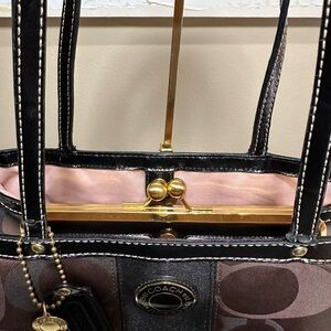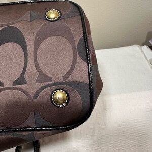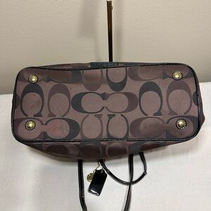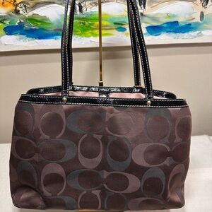 Stylish Coach tote with signature pattern. Dark brown and black design. Perfect for everyday use. 2012 / 15”x 9.5” approximately.