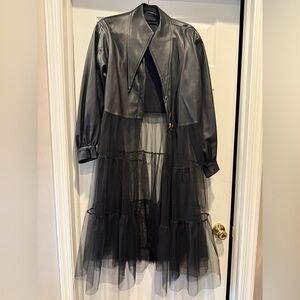 This stylish black vegan leather jacket features a unique sheer tulle skirt design, perfect for adding a touch of elegance to any outfit. Ideal for both casual and formal occasions. The skirt has an opening in the front. Leggings or tights would accompany this dress nicely! NEVER BEEN WORN.