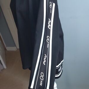 Stylish mid-weight black long sleeve shirt featuring white stripe details on the sleeves and back hem. Cotton/poly. Banded cuffs and split hi-lo hem. In excellent, barely worn condition. Approx 25" from shoulder to hem and 22" from armpit to armpit.