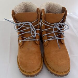 Timberland Authentic Waterproof Teddy Fleece boots in wheat nubuck with a white sherpa collar and light blue laces womens 7