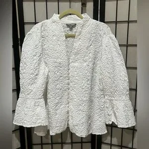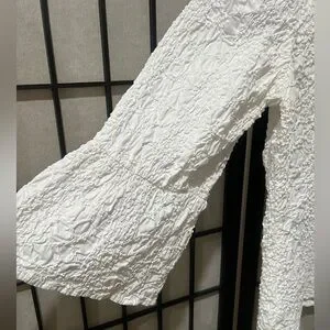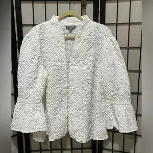 Elegant white textured blouse with button-up front. Features long BELL