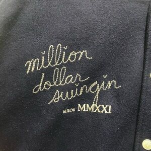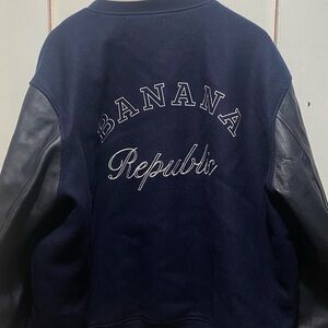 Stylish varsity jacket with bold branding. Features blue body and black sleeves. Ideal for a sporty look.