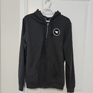 Stylish black zip-up hoodie featuring a distinctive logo on the chest. Comfortable and versatile for everyday wear. Unisex.