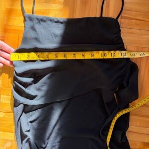 Black Y2K asymmetric top with a fitted, stretchy feel. Unique uneven hem for that early-2000s vibe, easy to dress up or down.