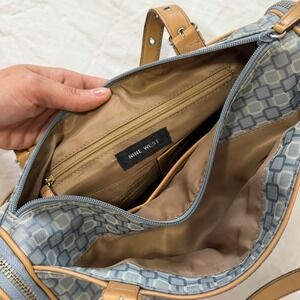 Nine West Shoulder Bag Blue Gray Pattern Tan Leather Trim Zip Top