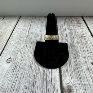 This ring was designed and made in Estes Park Colorado at Village Goldsmith Jewelers. It is unique and beautiful. Can be worn for all occasions and was originally bought as a wedding band. It is a size 8 but you ca have it sized if needed by the right jeweler. Village Goldsmith is an excellent choice if sizing needed.