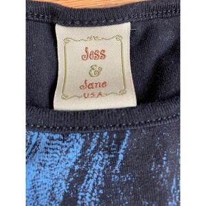 Jess & Jane abstract print long sleeve tunic top in size L. This top features a vibrant and artistic print with swirling patterns in shades of blue, black, purple, green, and yellow. The design creates a unique, flowing aesthetic. The garment is made from 100% cotton for comfort and breathability. Quarter length sleeves.