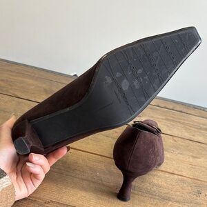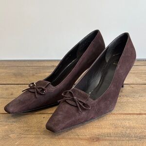 Chic dark brown suede heels with a stylish bow accent. Perfect for elevating any outfit.
