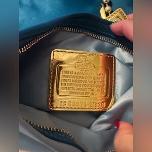 Authentic Coach Vintage Amanda Satin Fold Over Clutch Handbag! Teal & Aqua Silk & Accented by gold hardware. Perfect for any occasion! Absolutely gorgeous piece!! NWT only been stored in my Closet! Non Smoking Home. Change turn-lock apt on back of bag. 2 zipper openings. Adorable Gold Chain and Gold Coach Hangtag. No stains, holes, etc. excellent condition! Excellent shipper!