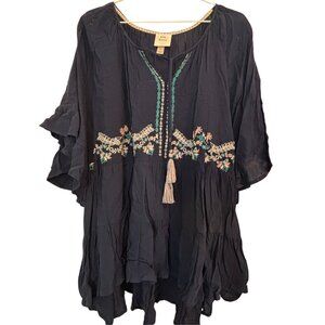 This tunic has embroidery around the waist and at the neck with ties and gathers around the neck with a ruffle at the bottom and on the sleeves. It measures 29" from shoulder to hem and 22" across at the bust so 44" around.