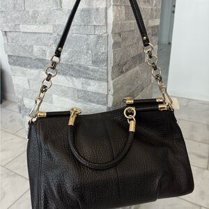Chic black leather shoulder bag by Coach. Features elegant gold hardware. Perfect for stylish outings.