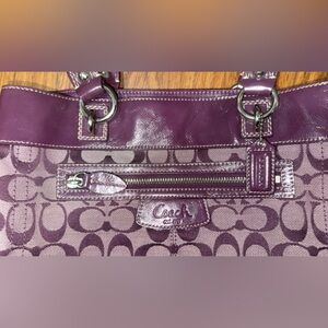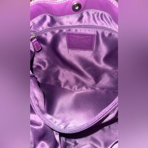 Stylish plum shoulder bag by Coach. Features signature pattern and elegant design.