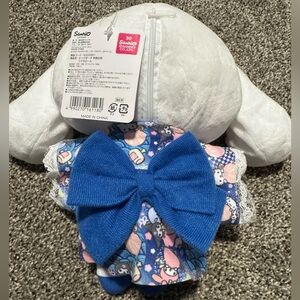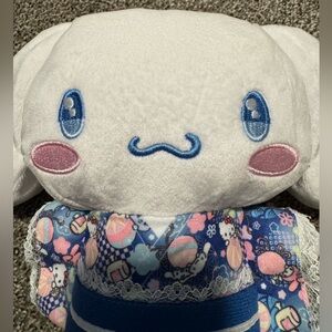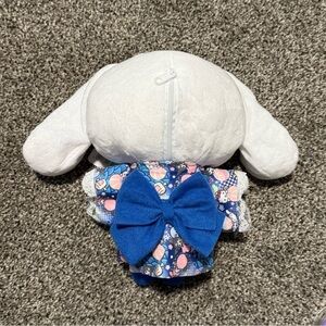 Adorable Sanrio Cinnamoroll plush. Features a cute blue and white outfit with colorful patterns. Perfect for cuddling and play.