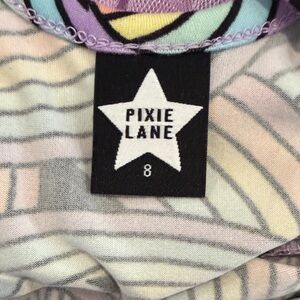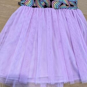 Colorful short sleeve dress by Pixie Lane featuring a vibrant rainbow pattern and purple tulle bottom. Ideal for fun occasions. New with tags