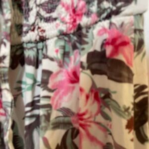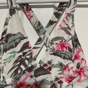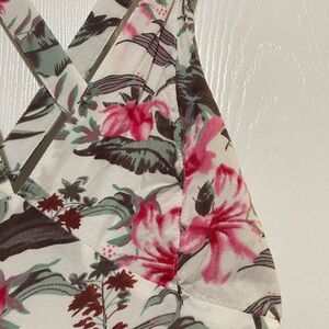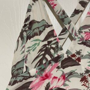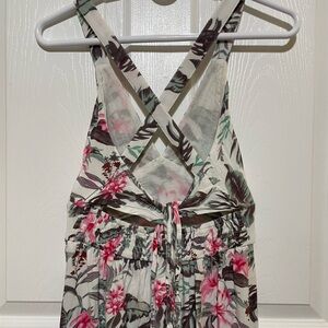 Elegant floral Deep V-neck halter Maxi dress with Cross Strap Tie Back featuring pink and green Hibiscus Tropical Print. Made with Rayon Challis- S