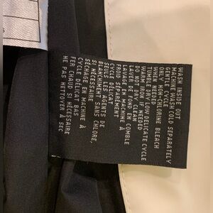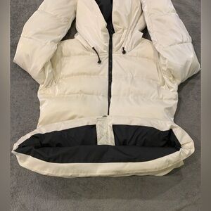 Elegant cream and black sub zero coat. Zip pockets and an inside pocket. This coat has a beautiful iridescent sheen. It is water and wind resistant and also machine washable.