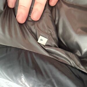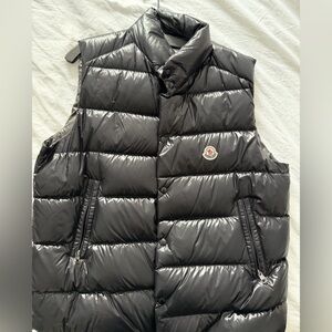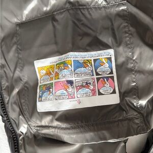 Sleek black puffer vest by Moncler. Features unique comic strip detail inside. Size 6