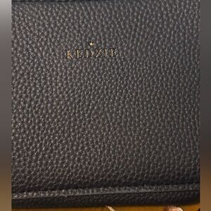 Kedzie zippered crossbody in a pebbled blueish black vegan leather. Also included is a Kedzie “Essential Only” cash & card wallet in the design Gilded