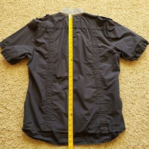 Elevate your casual style with this Monarchy men’s short sleeve button-up shirt in size XL. Crafted from 100% cotton, it features a modern fit, double chest pockets, and a clean blue tone perfect for everyday wear. The contrast between the navy overshirt and the striped collar underneath really helps this shirt stand out.