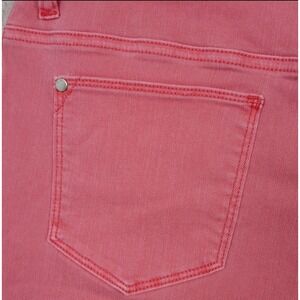 Chico's Perfect Stretch Girlfriend Slim Capri jeans in a vibrant coral hue. These capris feature a classic rise and are designed with an eased fit through the hip and thigh for ultimate comfort. The distressed frayed hem adds a modern, casual touch. Ultra-comfy stretch fabric with world-class shape retention ensures a flattering and comfortable wear. Perfect for a casual day out, a weekend brunch, or a relaxed evening gathering. Chico's size 1.5