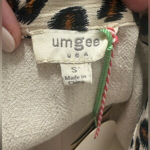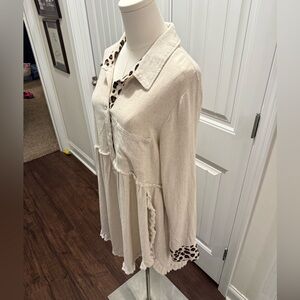 Cream color linen and cotton blend dress with leopard print details on sleeve cuffs, inside collar, and along button side of top part of dress. Ideal for stylish outings. Frayed ends. Slightly longer in the back than front with a slightly oversized fit. Large chest pocket on left side. NWT. Measurements in photos.