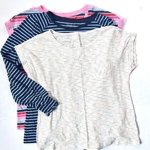 This listing is for three (3) striped Talbots tee shirts — two (2) lightweight, breezy short sleeves and one (1) cotton ruffle cuff long sleeve — they are all size large (12/14) and in excellent condition with less than “less than minor” to no signs of use or wear whatsoever.