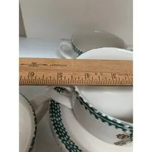 Beautiful soup mugs and matching plates. Green sponge around edge of mugs and plates. Mugs have pinecone design on each.