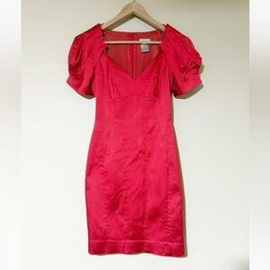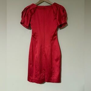 Vintage Karen Millen red satin dress. This vibrant dress is a standout with a special pleated design at neckline and sleeves. Most likely late 1980’s, a special piece in great condition.