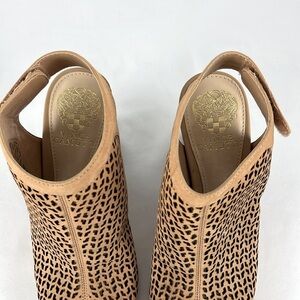 Vince Camuto Camel Nubuck Perforated Leather Peep-Toe Sandal Stacked Wedge Block Heel - Dastana, Sz 7M / 37.5