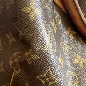 Chic Louis Vuitton tote with iconic monogram pattern. Features sturdy brown leather handles. Beautiful bag unfortunately the zipper is broken. That would need to be repaired otherwise in wonderful condition one little crack shown in photo and needs a good cleaning