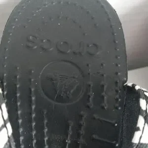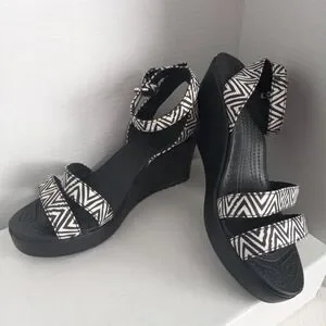 Step out in style with these chic black and white patterned wedge sandals. Perfect for any occasion, these crocs shoes offer both comfort and elegance.