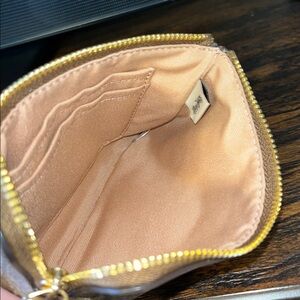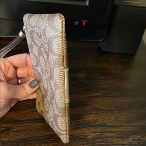 Elegant Coach wristlet with signature pattern. Features tan and brown design. Includes a wrist strap for easy carrying. Corner zip, with card slots inside. Excellent condition, preowned, but I don’t think I ever used it.