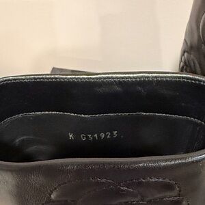 Elegant black leather boots with embossed floral design. Iconic CHANEL style.