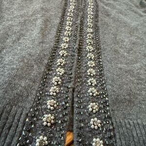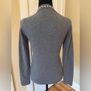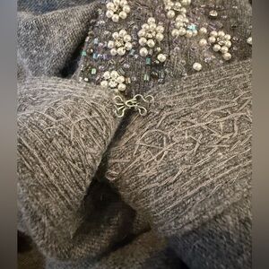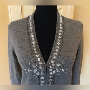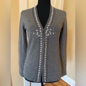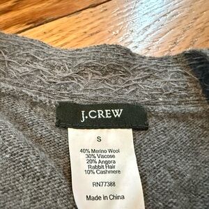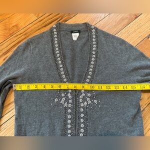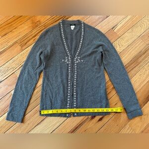 J Crew Wool/Angora/Cashmere blend vneck cardigan sweater, women’s size small. Gray with floral beaded details. Good condition. There are a few small beads missing but unnoticeable. No rips, holes, stains or odors. Please see photos for item details/dimensions. Some photos may appear different in color due to lighting. Ships from smoke-free home.