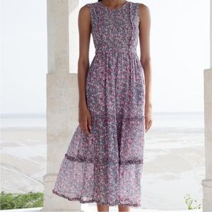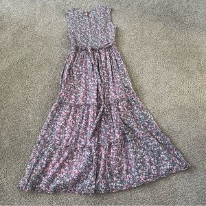 Scatter wild rose print, smocked top, tie waist belt, ruffle trim, ankle length, excellent preowned condition