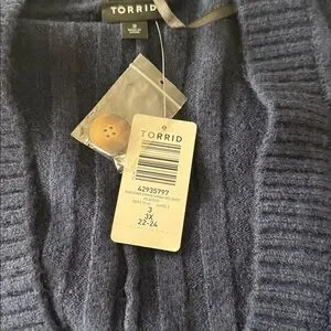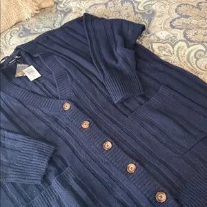 Stylish deep blue cardigan with ribbed design. Features a button-up front.
